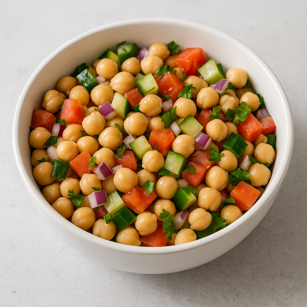 - 병아리콩 샐러드: 삶은 병아리콩에 오이, 토마토, 파프리카, 레몬즙 드레싱