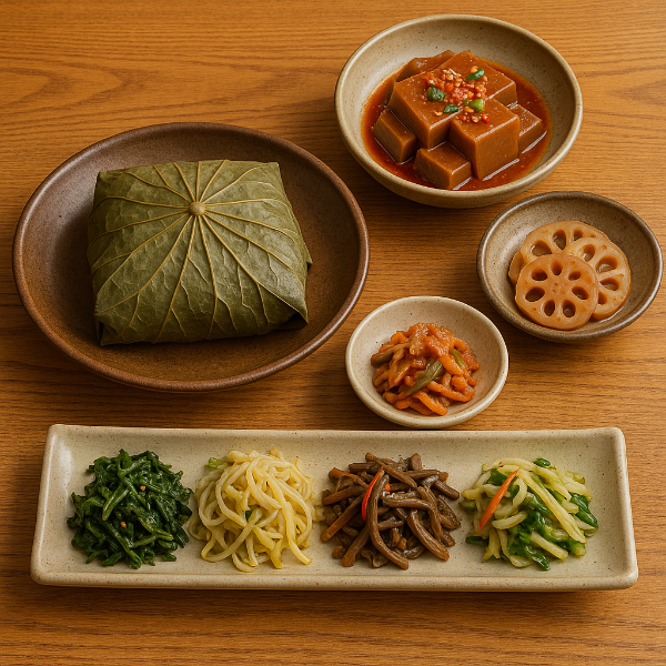- 연잎밥정식: 도토리묵, 연근무침, 나물 반찬과 함께 건강한 한끼